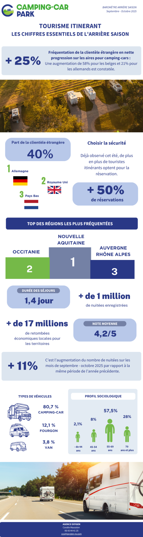 CAMPING-CAR PARK, 1er réseau européen d’aires d’étape et campings communaux pour véhicules de loisirs, dresse le bilan de l’arrière-saison 2025 (1er septembre - 31 octobre). Malgré un contexte géopolitique instable et une météo variable, la période affiche une belle dynamique : la fréquentation globale progresse de +11% par rapport à 2024, portée par une hausse record des clientèles étrangères.