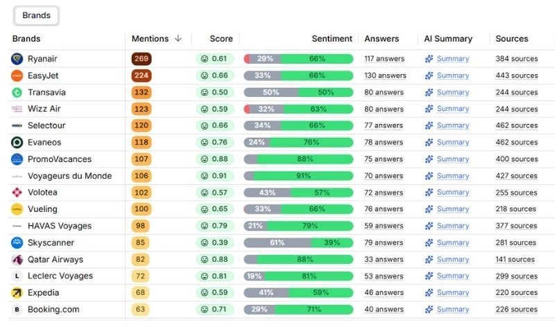 Certaines marques comme Expédia (18 % de sentiments négatifs) doivent être vigilantes à propos des narratifs renvoyés par les LLMs.