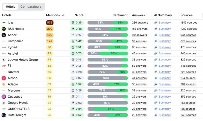 Les comparateurs en ligne jouent un rôle de premier plan dans le positionnement des hôtels dans les réponses des IA génératives. Booking.com, Expedia, Hotels.com... Ces plateformes agrègent des millions d’avis, de descriptions et de données tarifaires, autant de contenus que les LLMs absorbent et réutilisent pour construire leurs recommandations. Quand un utilisateur demande à ChatGPT "quel est le meilleur hôtel pas cher à Paris", l’IA va puiser ses réponses dans les sources les mieux référencées sur le web, et les comparateurs en dominent largement le paysage. Résultat : un hôtel qui n’est pas bien représenté sur ces plateformes (description incomplète, peu d’avis, informations obsolètes...) sera moins présent dans les réponses IA, même s’il dispose d’excellentes offres.