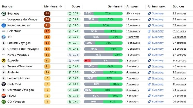 Alors que les Français se tournent de plus en plus vers les IA génératives comme ChatGPT, Gemini ou Claude pour organiser leurs vacances, quelles sont les requêtes qu’ils formulent pour trouver le séjour idéal ? Compagnies aériennes, agences de voyages, hôtels quelles sont les marques qui sont citées par les LLMs et quelle image renvoient-elles ? Pour le savoir, Brandwatch a utilisé ses capacités de Gen AI Monitoring afin d’aider ces marques à mesurer leur visibilité et les sentiments qu’elles génèrent sur ChatGPT et consorts.